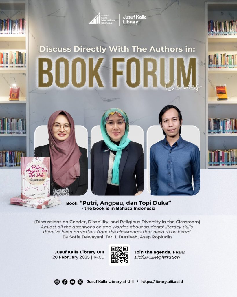 Acara akan digelar di Jusuf Kalla Library, Universitas Islam Internasional Indonesia pada Jumat, 28 Februari 2025, pukul 14.00 WIB. Buku ini ditulis oleh Sofie Dewayani, Tati Wardi, dan Asep Ropiudin. Buku mengulas gender, disabilitas, dan keragaman agama di ruang kelas.